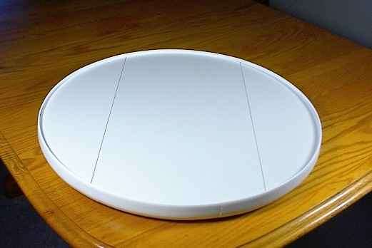 Now here is something totally new and unique. I call it the Folding Lazy Susan. I designed it to fit into the large storage spaces in your kitchen cabinetry. In many situations you will have plenty of storage space, but it will be difficult and annoying to get to the stuff in the back. In many instances, the access doors to these spaces are quite narrow, or there may be a support structure blocking the front. All of the Folding Lazy Susans are 22 inches in diameter. If you are considering an installation in your overhead kitchen corner unit and not sure if this will fit, please click here to find instructions on how to make a simple circle pattern. Custom sizing is available. Please email for a quote. This susan utilizes the Concealed Hinging system. It provides a smooth clean surface for your fine china, glass stemware and Crystal. This unit is very easy to assemble inside of your shelving. The edging provides a handy raised lip which will keep your items from sliding off. If you have an overhead kitchen cabinet similar to the one pictured below, I’m sure that you will find my new Folding Lazy Susans quite useful.. Be sure to view the installation sequences below to see some useful applications.
