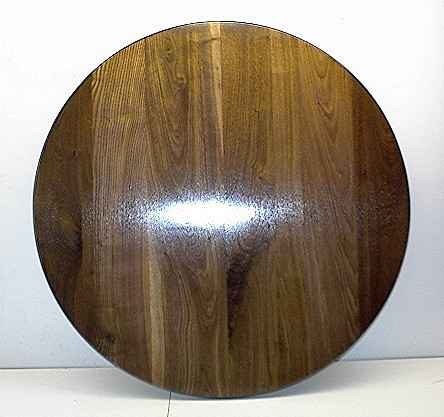 Here is the Walnut, also known as Black Walnut. These pieces are the natural color of the wood with a clear coat finish. I use a Superior Grade of lumber picked for grain pattern and even color. It is comprised of the heartwood of the tree. Using this high quality lumber will produce the very best look. You should be aware that other woodworkers may use a lesser grade of wood trying to save money. This will generally produce an inferior looking piece. Steaming is a common practice used on Walnut in an attempt to try to even out the color between heartwood and sapwood. Sapwood is much lighter. I understand that when you consider one of my lazy susans for your beautiful walnut dining room table, it must be as good a quality as the table it will be displayed on. Other items you must consider are service and timely shipping. Does it annoy you when you hear your order will be shipped in 6 to 8, maybe even 12 weeks? When you pay top dollar for one of my pieces, you are assured of not only a high quality piece of furniture, you will also recieve top quality service. My commitment to you is that in most circumstances lead time will be limited to one week or less from date of order to ship date. I am often asked “What size susan would be good for my table?” Well, if it’s going to be a decorative susan, then it can be any size you like. However, if it’s to be a functional piece, I like to recommend a minimum of 12 to 14 inches of “plate room” all the way around the susan. A good way to see how this would look is to make yourself a circle pattern out of paper. Click here for an easy way to make one. Then place it on your table and arrange some place settings around it. This will give you a very good idea as to how your susan will fit once you recieve it. Custom sizes are available. Simply email me for a speedy quote.